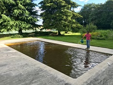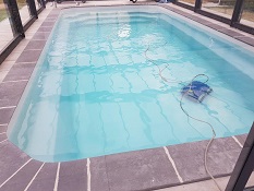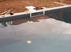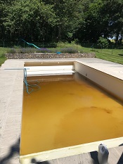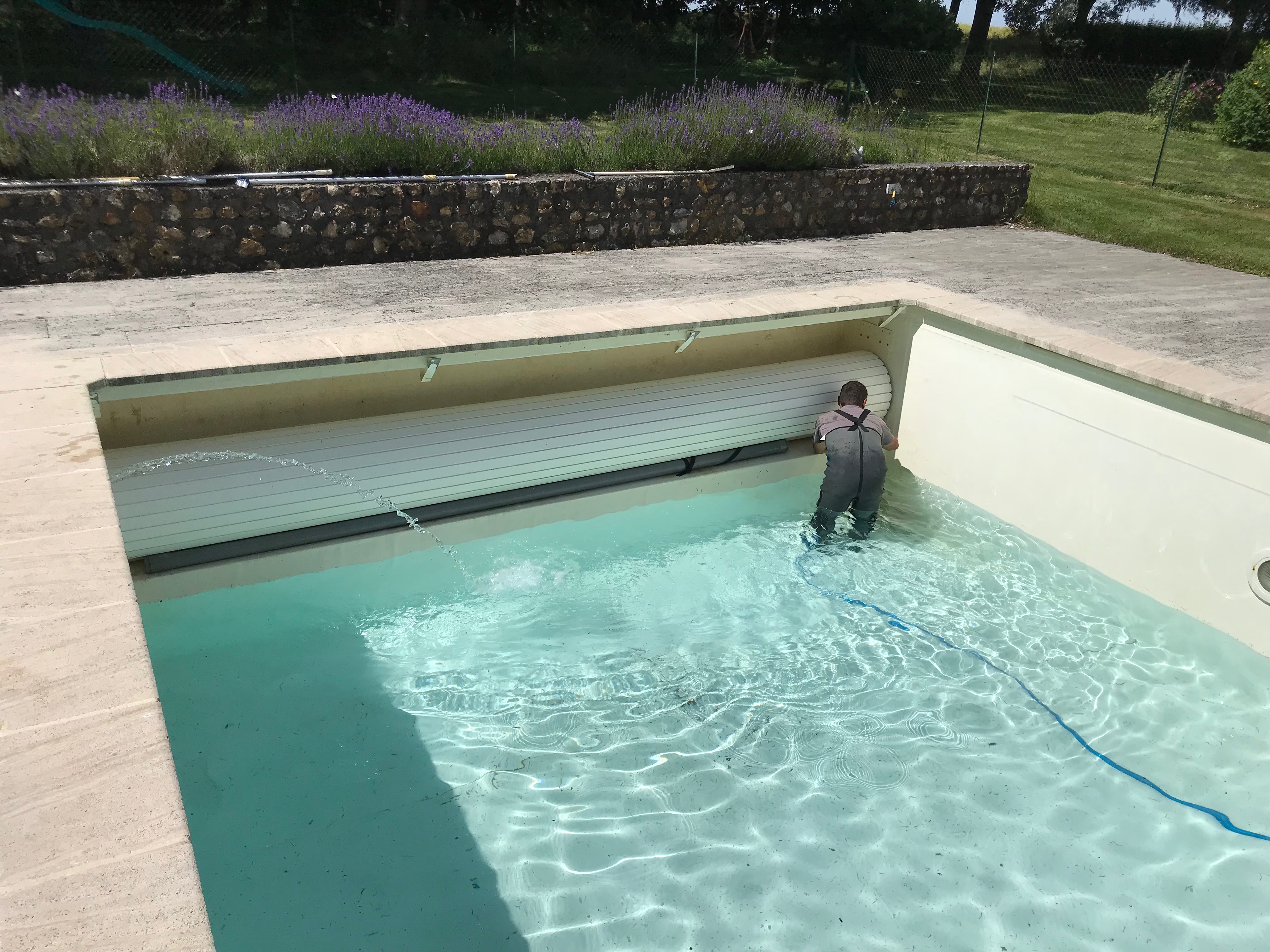 Ci-contre : Rénovation d’une piscine béton avec membrane armée suite à une coulée de boue (Juin 2018) et réparation de volet immergé.